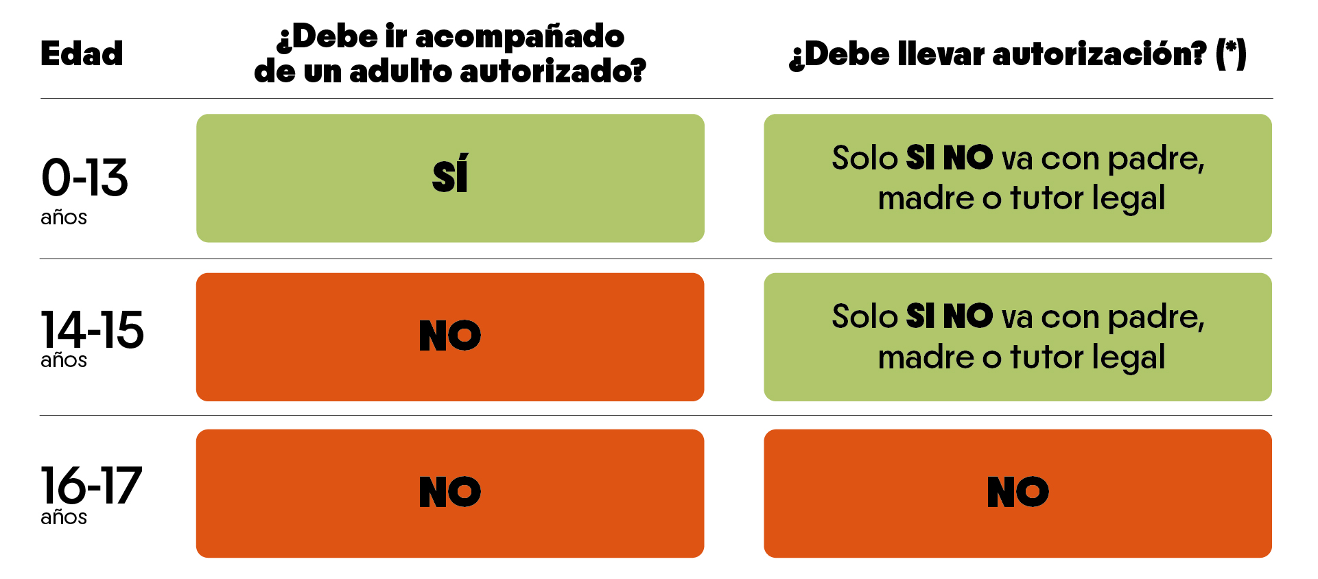 Deben traer 2 copias de la autorización rellenadas y firmadas por madre, padre o tutor legal y 2 copias del DI del padre, madre o tutor legal. Una para entregar en el acceso y otra para llevarla en todo momento consigo.