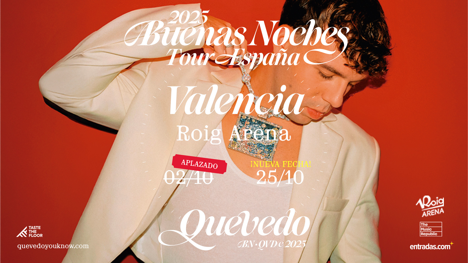 Desde la organización de Taste The Floor y DQE Productions, promotoras del concierto de Quevedo, se informa de que, por motivos de salud del artista, su actuación prevista para hoy, 2 de octubre de 2025, en el Roig Arena, queda pospuesta para el 25 de octubre de 2025 a las 19h.